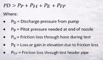 We must demonstrate that the pump discharge pressure is greater than the sum of the pitot pressure required at the end of the nozzle, the friction loss through the hose during the test, the loss or gain of pressure due to elevation, and the friction loss through the test header pipe in order to hydraulically calculate the test header pipe size properly. The equation below explains this: