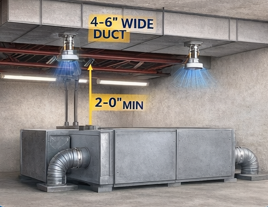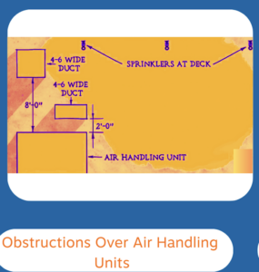 6. Obstructions Over Air Handling Units. Description- Are sprinklers needed under a main duct above the air handling unit, as the linked picture shows? This subject discusses sprinkler system needs and fire safety concerns for spaces blocked by big ducts. Question 6. As illustrated in the attached image, are sprinklers needed below a major duct over the air handling unit?