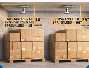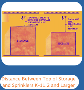 12. Distance Between Top of Storage and Sprinklers K-11.2 and Larger. Description- We are investigating whether using K-11.2 or larger sprinklers necessitates a 36-inch clearance from the top of the solid pile storage to the sprinkler deflector. While 18 inches is the typical clearance, sprinklers such as CMDA, CMSA, and ESFR that have a K-factor of 11.2 or above may require a 36-inch clearance. Question 12. Using K-11.2 or bigger sprinklers, we are looking at if a 36-inch clearance need exists from the top of the storage solid pile and deflector. Although 18 inches is standard, for CMDA, CMSA, and ESFR, greater K factors like 11.2 call for a 36 inch clearance from the top of the storage and deflector.