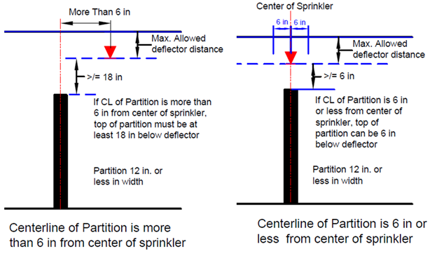 “Partition Rule” : Two special obstruction regulations apply to suspended or floor-mounted barriers that do not reach to the ceiling, such as half walls, cubicle walls, and so on. The first is limited to light danger occupancies and can be regarded as the beam rule reversed.
