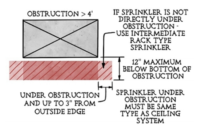 “Wide Obstruction Rule”: As previously indicated, sprinklers should be installed under fixed obstructions that are more than 4 feet broad. The rules from the 2022 edition can be summarised with the following figure: