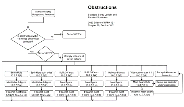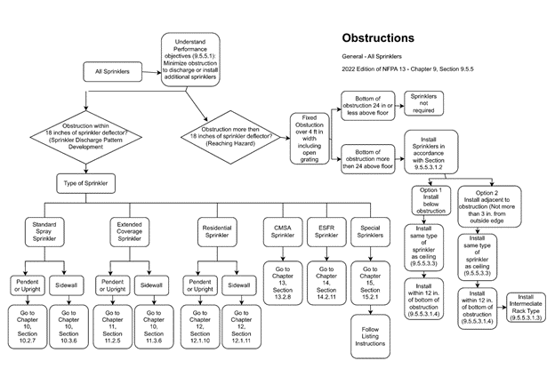 Step 8: Universal Obstruction Rules: Chapter 9 of NFPA 13 contains rules that apply to all sprinkler types. These regulations are extended in the chapters relating to the sprinkler type chosen. This flow chart will provide a general summary of how to apply the following general rules: