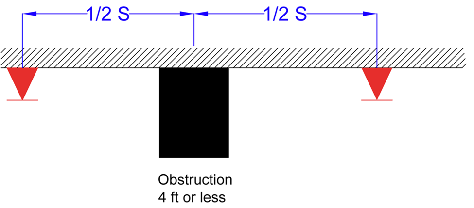 “Sprinklers on Opposite Sides of Obstructions Rule”: If an impediment is less than 4 feet wide, sprinklers can be installed on either side as long as they are not more than ½ the permissible distance between sprinklers, which is normally 7 ½ feet apart.
