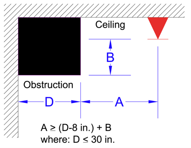 “Soffit Rule #1”: Where an obstruction is against a wall, such as a soffit, and is not more than 30 inches wide, permissible sprinkler locations can be found using the following equation: