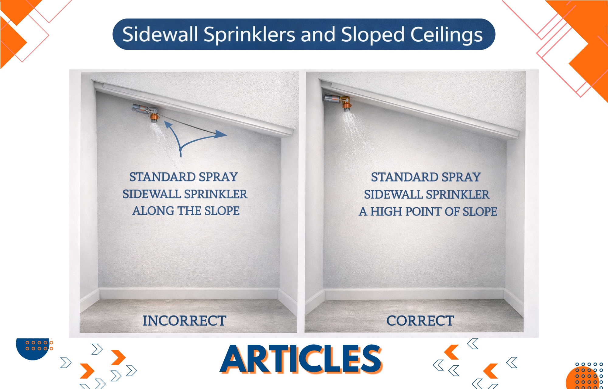 It should be noted that the residential sprinkler section does not have the same restriction. As the standard is silent on this matter, it would be necessary to follow the manufacturer’s instructions, which in some cases allows residential sprinklers to be installed along slopes.