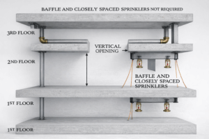A three-story building has a staircase open to the floor on each level. This is considered a vertical opening that will require closely spaced sprinklers and draft curtain in accordance with Section 9.3.5 of the 2019 edition of NFPA 13.