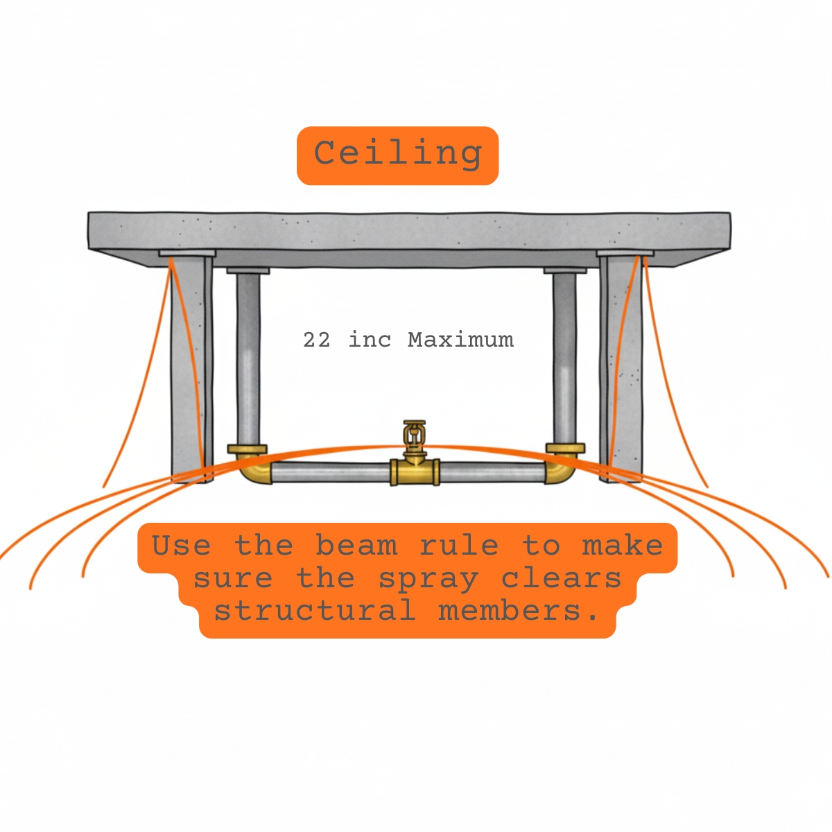 The bottom of the 22-inch beam would be level with a sprinkler set with the deflector 22 inches below the deck, according to this part. This might be regarded as an exemption to the standard requirement that the sprinkler be positioned 1 inch to 6 inches below the bottom of the beam because it complies with sections 10.2.6.1.2 (2) and 10.2.7.1.2 (beam rule).