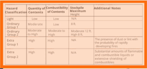 Based on the quantity and combustibility of the materials as well as stockpile height, light, ordinary, and extra hazards are classified. This information is summarized in the table below.