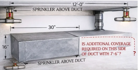 Ans. Installing a sprinkler under the duct eliminates the need for an additional sprinkler above it (within 7.5 feet of the centerline). Because there is a sprinkler beneath the obstacle, the ceiling sprinklers above do not consider the shielded duct an obstruction.