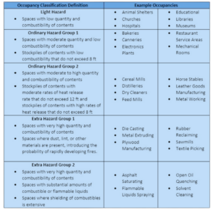 In the 2022 edition of NFPA 13, the design criteria for non-storage applications are grouped based on occupancy classifications (Chapter 4). NFPA 13 defines the occupancy classification, or hazard classification, depending on the level of fire hazard in a given location. This is not to be confused with the building code’s occupancy classification, which describes the space’s entire hazard, not only fire hazards. The NFPA 13 occupancy classifications are divided into categories. It’s worth noting that a building might have numerous classifications.