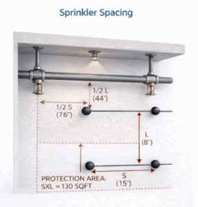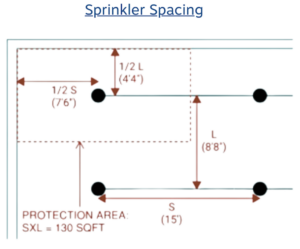 The maximum protective area limits sprinkler spacing. For an ordinary occupancy classification, the maximum sprinkler spacing is 15 feet. Sprinklers set 15 feet apart in one direction are limited to 8 feet and 8 inches in the perpendicular direction to maintain a maximum protection area of 130 square feet. The “S X L rule” is used to determine the distance between sprinklers along branch lines, whereas L denotes the distance between sprinklers on neighbouring branch lines.