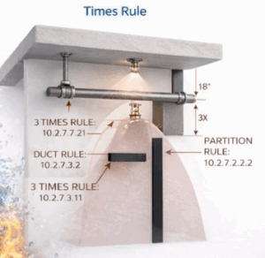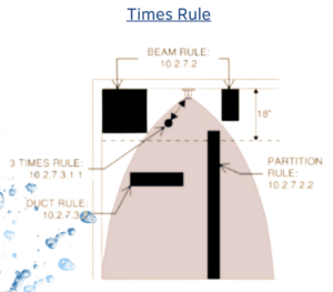 As previously mentioned, there are two factors that can affect the degree of a blockage. Obstacles increase with size and proximity to the sprinkler. According to Section 10.2.7.3.1.3, sprinklers must be spaced at least three times the largest diameter of the blockage. This section is commonly known as the “3 Times Rule.”. This regulation is only applicable to horizontal impediments within 24 inches of the sprinkler and vertical impediments.