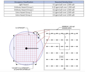 NFPA 13 specifies both the minimum sprinkler density and the design area for calculating sprinkler flow. NFPA 13 uses the design area rather than an estimated fire size or testing results to determine the number of sprinklers required in a fire for a particular occupancy classification. Table 19.2.3.1.1 in NFPA 13 contains the densities and required areas of operation for each occupancy classification. A summary is provided below.
