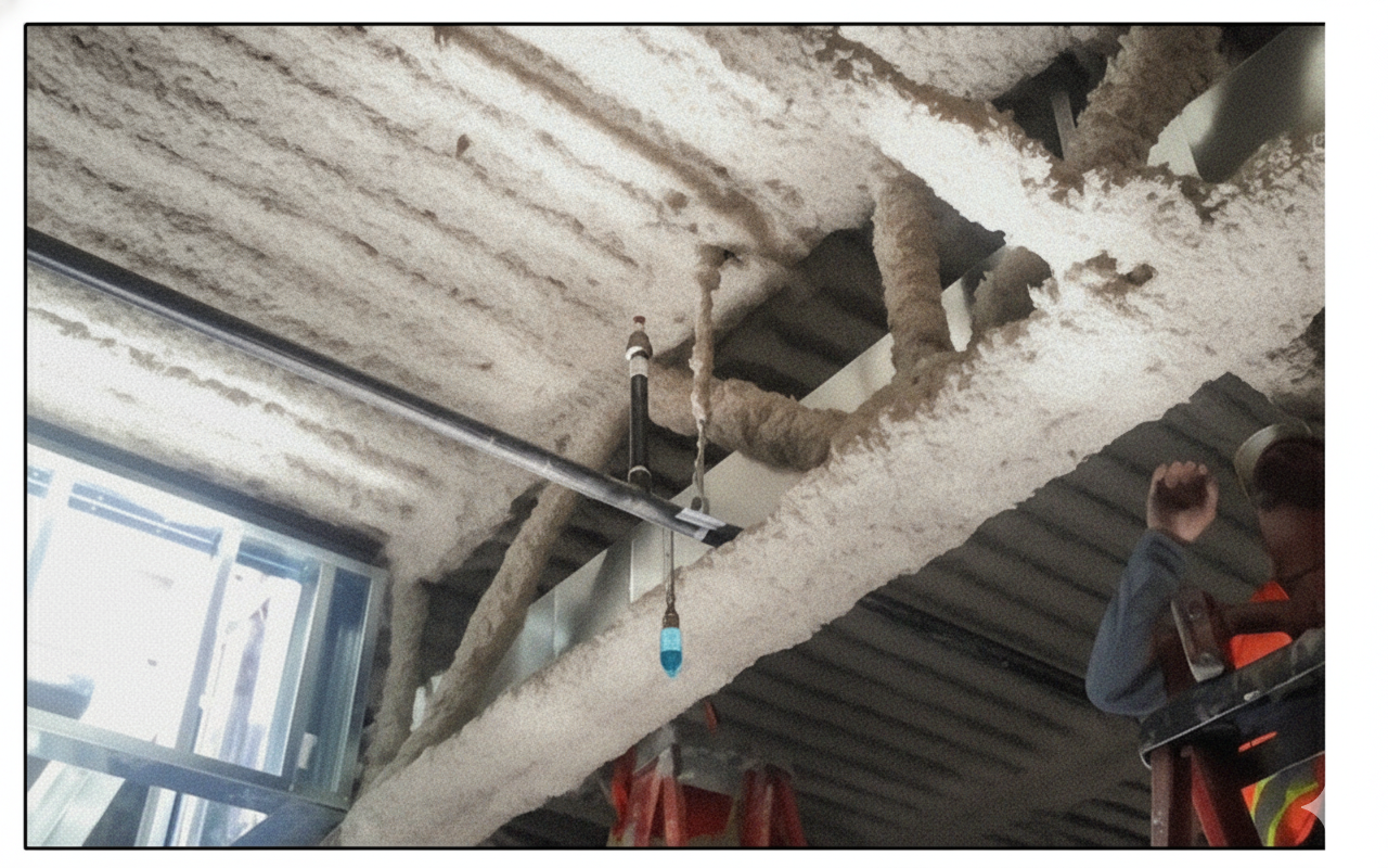 Insulation. In both of the images below, insulation has been added. One sprinkler is visibly “buried” and only visible because the photographer removed some of the material to reveal it. In the other case, the sprinkler deflector distance looks to be “under” the insulation, but it should be examined more closely to assure compliance and proper operation because it appears to be close to it. If the implications are not considered during design and installation, they might be disruptive.