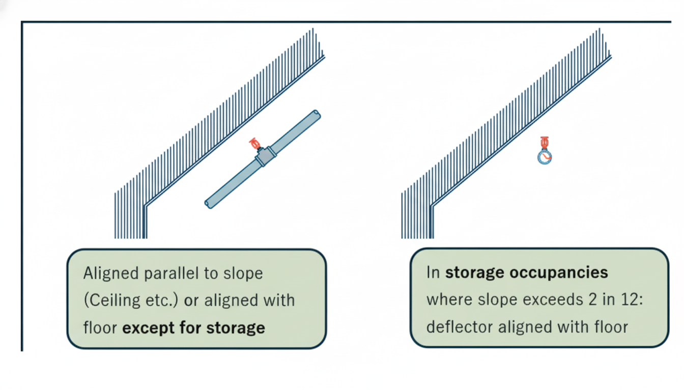 Deflector orientation. The angle of the sprinkler deflector and the pitch of the roof or ceiling are essential factors in appropriate positioning. Based on the findings of testing for ESFR storage applications in sloped ceilings, the 2025 edition of NFPA 13 now requires deflectors to be parallel with the floor in all storage applications where the ceiling slope exceeds 2:12, and allows for flexibility in all non-storage applications to orient the deflector with the ceiling slope or parallel to the floor. In previous editions, the deflector was typically installed parallel to the pitch of the ceiling whenever the slope surpassed 2:12.