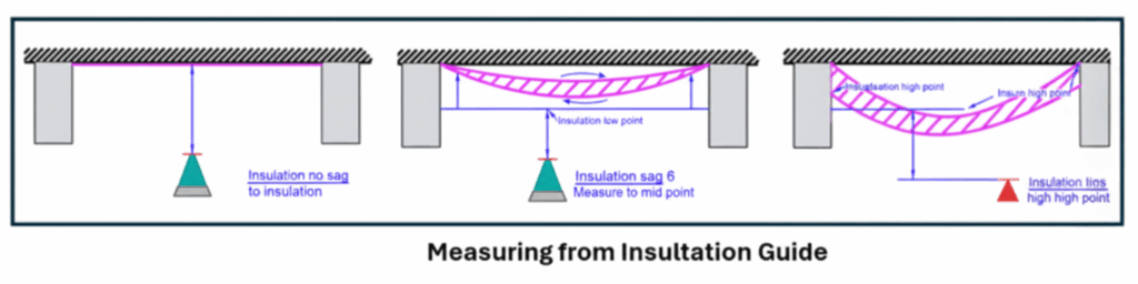 Insulation on the underside of the ceiling or roof structure. Insulation is commonly added on the structure’s underside, and the depth of such insulation varies depending on the exterior climate. Not only can the existence of this material influence the sprinkler’s placement, but the manner in which it is installed can also play a role if the insulation “sags” away from the structure. To solve this problem, Section 9.5.4.1.3 states that the deflector distance must be calculated from the underside of the insulation, unless the insulation sags. If the sag is six inches or less, the measurement must be taken at the centre of the sag. If the sag reaches six inches, we take measurements from the highest point. The standard also requires that if the insulation is not “batt” type, it must withstand 3 lb./ft2 of “uplift” force – this is to ensure that during a fire event, the energy from the fire plume does not “lift” the insulation layer up, increasing the deflector distance and potentially delaying activation.