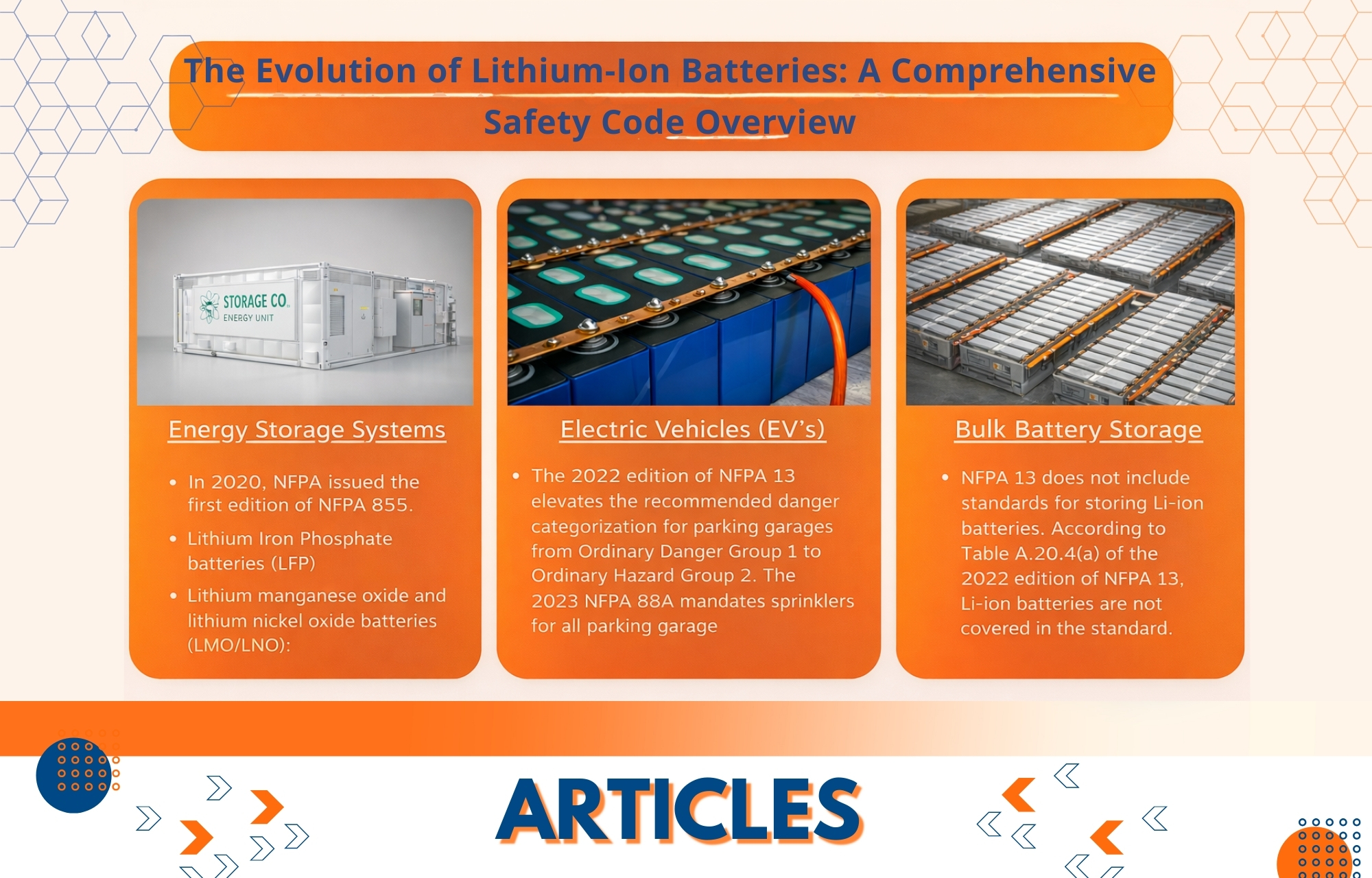Bulk Battery Storage Standards and see that NFPA 13 does not cover Li-ion batteries. We also learn from FM Global Data Sheet 8-1. The article concludes by discussing safety problems for electric vehicles (EVs) in parking garages, emphasizing the changing requirements in NFPA 13 and NFPA 88A. As Li-ion battery usage increases, the guide emphasizes the growing necessity for detailed guidance on safety rules.