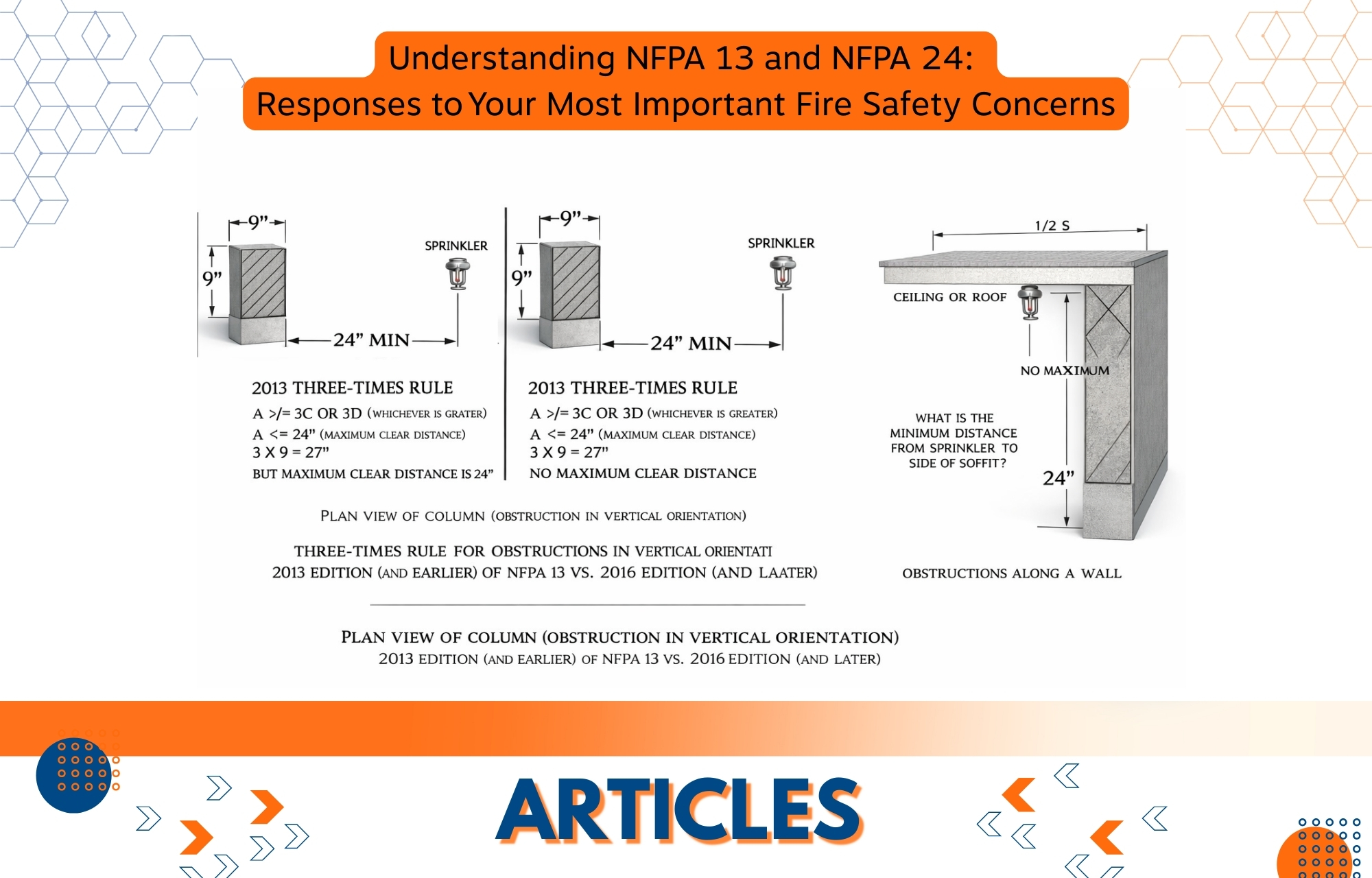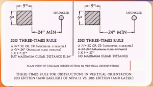 This article from the October 2, 2015 issue #328 of NFSA’s TechNotes helps to clarify this change: Changes in the 2016 Edition of NFPA 13 Installation Criteria. Minimum distance from an obstruction in vertical orientation (8.6.5.2.1.3). Applying the guidelines of 8.6.5.2.1.3, sometimes referred to as the “three times rule,” the maximum clear space of 24 inches has been reduced for vertical orientation obstructions, including columns. Work by the NFSA E&S committee work group on shadow regions and fire testing has revealed that the “three times rule” allows a maximum clear distance of 24 inches, which is not ideal. This experiment revealed that the fire may not be under control when sprinklers are located near significant obstacles using this maximum clear distance allowance.