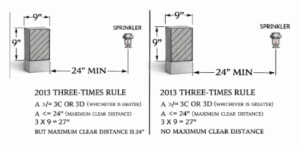 1. 3 Times Rule- Standard Spray Sprinkler. Description- Section 8.6.5.2.1.3 (B) in the 2013 version of NFPA 13 states a maximum distance of 24 inches between a sprinkler and a vertical impediment like a column. Starting in 2016, further versions eliminated this maximum limit, so depending on the dimensions of the obstacle, one must follow the ``three times rule``. For a 10-inch column, for instance, the sprinkler would have to be placed 30 inches away to comply. Question 1. Regarding Figure 8.6.5.2.1.3 (B) of NFPA 13 (2013), what is the minimal distance of a sprinkler to a column independent of the column's dimension? Is that 24 inches?