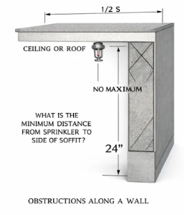 12. Obstructions Along a Wall. Description- A project consists of under 24-inch soffits that run along a wall. Under Section 12.1.10.2 (b), we omitted including a residential sprinkler under the soffit. With our household sprinklers spaced 16 by 16, 1⁄2 of S would be 8 feet. Question 12. The sprinkler's highest range from the wall is eight feet. The sprinkler is allowed to be how close to the soffit?