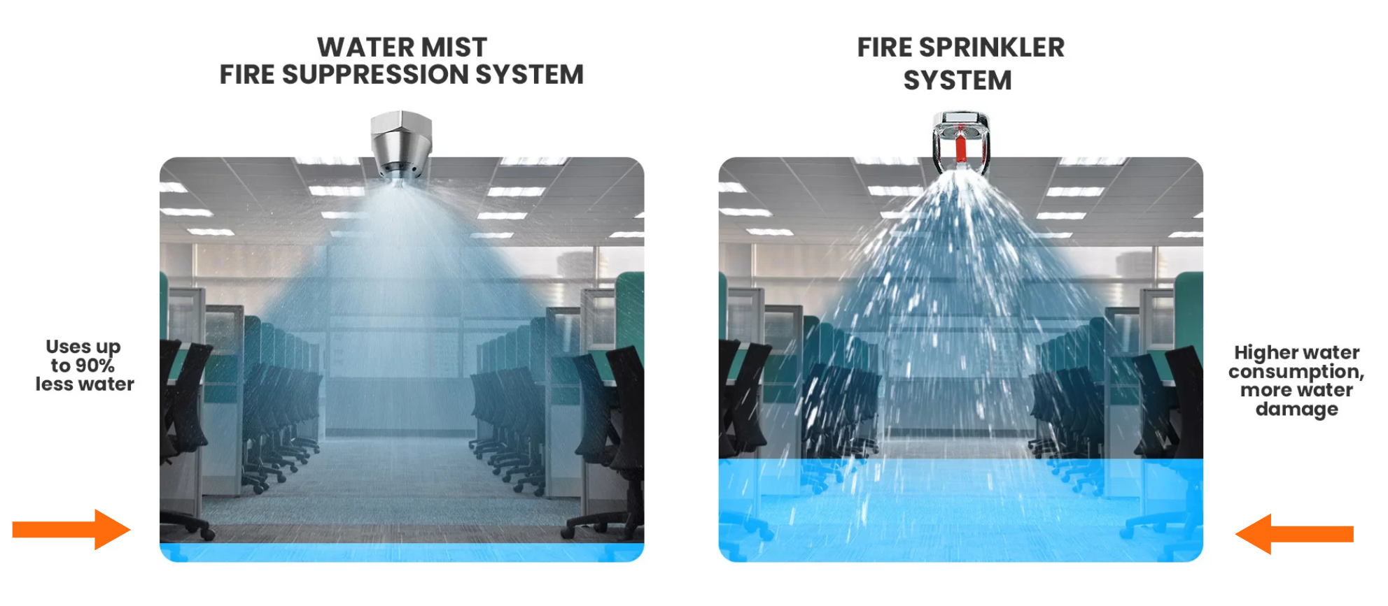 Water mist systems use significantly less water, reducing the risk of water damage while providing superior fire suppression efficiency. Unlike traditional sprinklers, they work by rapidly cooling flames and removing heat energy while also displacing oxygen, making them highly effective for environments with sensitive equipment.